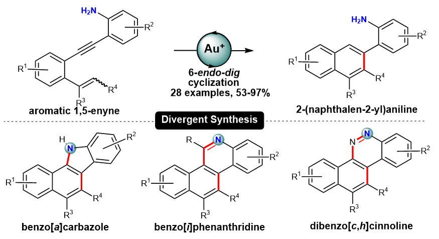 作者以芳香族 1,5-烯炔类化合物为底物,经途径可控的金催化环化反应,通过6-endo-dig环化过程,构建了2-氨基取代的萘环骨架,对底物适用性以及反应最优条件进行了考察,并以此为母核完成了苯并[α]咔唑、苯并[c,h]噌啉,二苯并[i]菲啶的合成。该研究解决了长期以来苯并[α]咔唑、苯并[c,h]噌啉和苯并[i]菲啶衍生物的合成缺乏统一方法的难题,也为更多复杂和有趣的杂环结构以及生物碱类天然产物的合成奠定了基础。