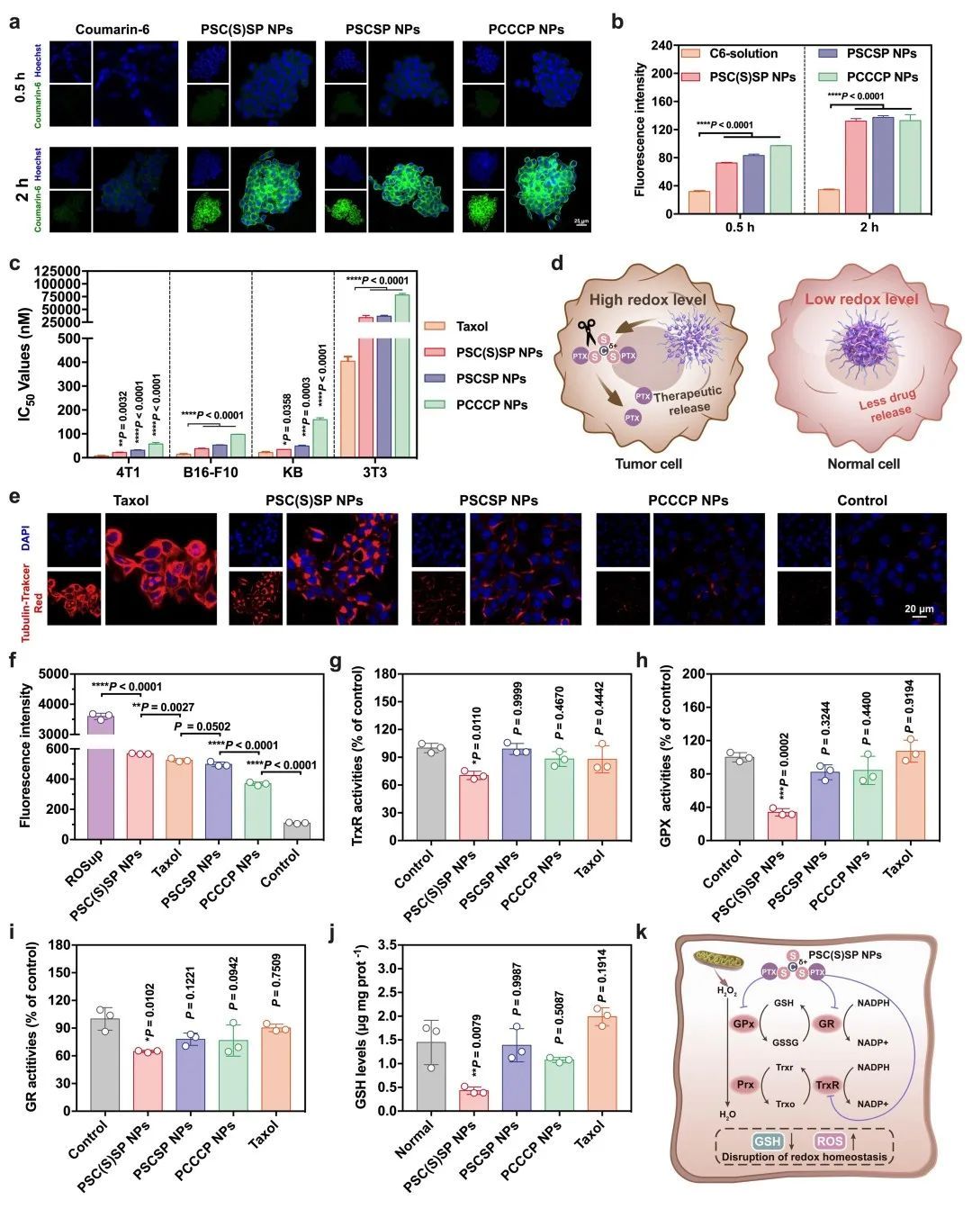 接下来,作者进行了体外细胞实验。在三种前药纳米粒中,-SC(S)S-键桥连的前药自组装纳米粒具有最强的细胞毒性、细胞凋亡和肿瘤选择性。这主要是归因于-SC(S)S-键具有氧化还原双重响应性,能够在肿瘤细胞内快速、特异性地释放药物。此外,作者发现-SC(S)S-键桥连的前药自组装纳米粒不仅通过释放紫杉醇抑制微管解聚,发挥抗肿瘤作用,还能抑制细胞内抗氧化防御酶,从而上调细胞内ROS水平并诱导肿瘤细胞凋亡(图4)。