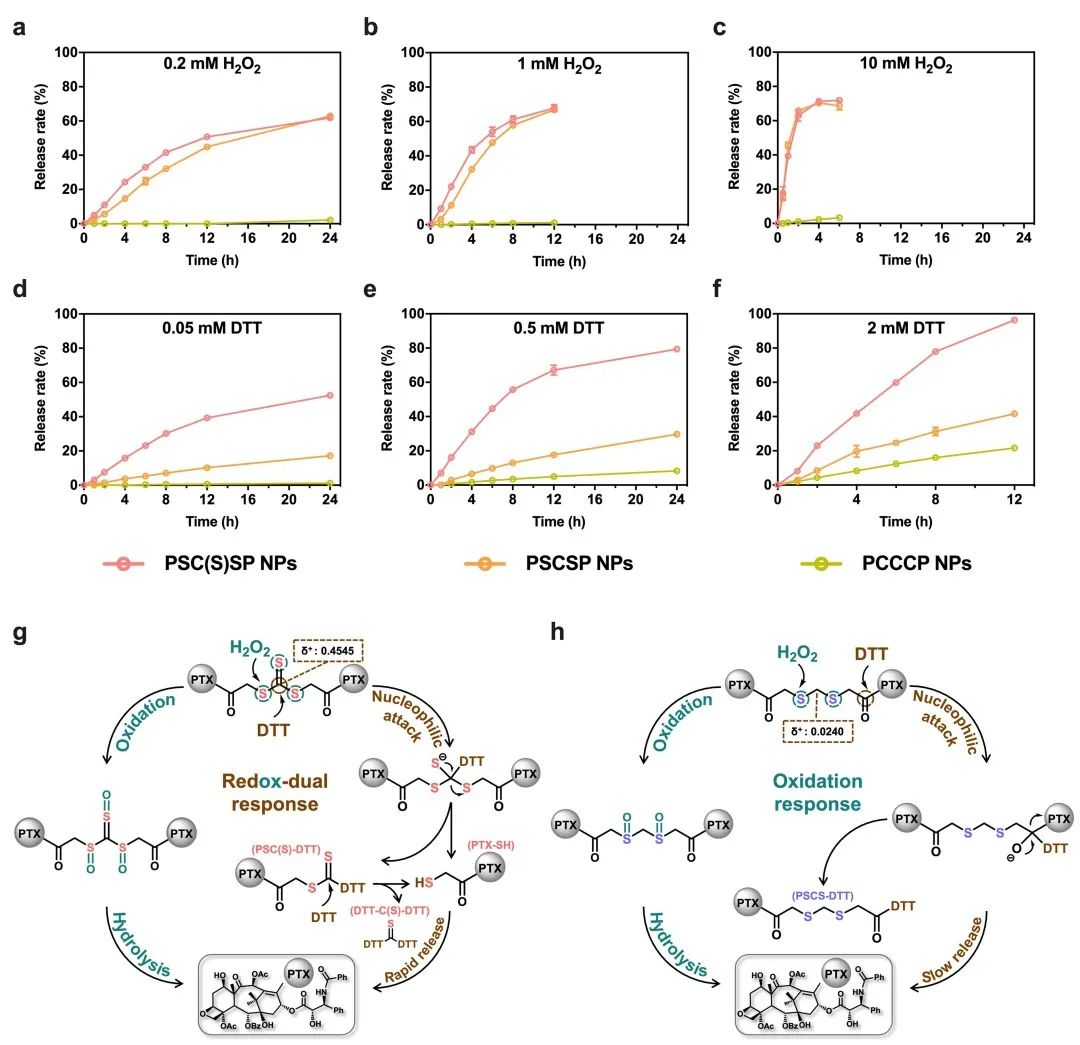 作者接着考察了前药自组装纳米粒的体外释放行为,结果如图3所示。-SC(S)S-键桥连的前药展示出氧化还原双重超敏性。其氧化敏感性主要归因于-2价的硫原子,能够被氧化成亲水性的亚砜,进而促进相邻酯键水解释放药物。而还原敏感性主要归因于亲电的中心碳原子,能够被亲核性的化合物如DTT或GSH进攻,生成巯基中间体,进而促进药物释放。然而,-SCS-键桥连的前药仅能响应氧化环境释放药物,-CCC-键桥连的前药作为非敏感对照基本不释放药物。
