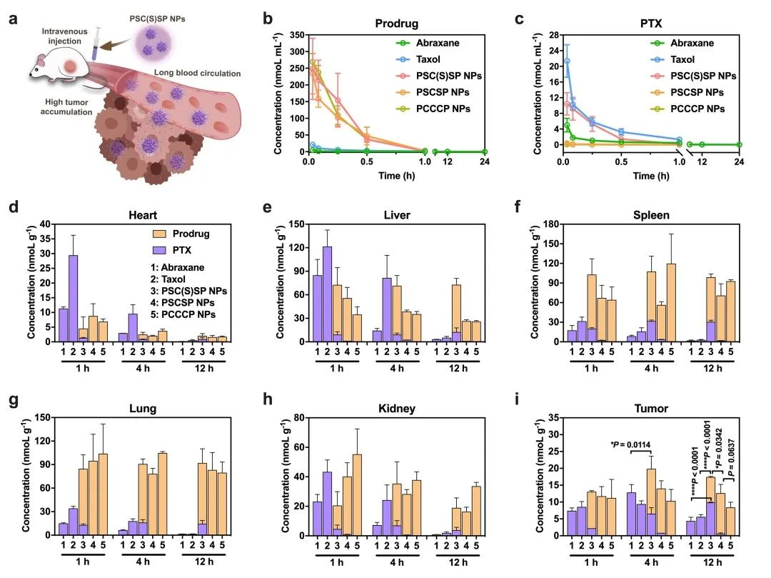 体内药动学结果表明,-SC(S)S-键桥连的前药自组装纳米粒因其较好的组装稳定性,在血液循环中能够保持稳定,仅有少量紫杉醇释放,有望减轻药物泄漏相关的毒副作用。此外,肿瘤蓄积结果显示,-SC(S)S-键桥连的前药自组装纳米粒能够随时间逐渐释放紫杉醇,且在12 h时,其肿瘤中紫杉醇的释放量远高于其他组(图5)。这为该纳米药物在肿瘤治疗中的有效性提供了有力的支持。