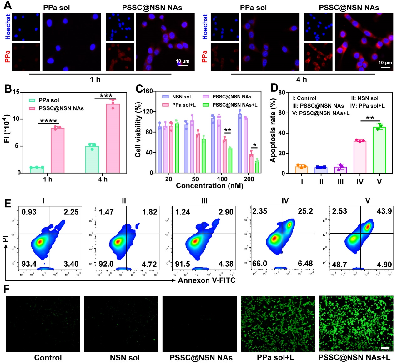 作者接着考察了超分子纳米组装体的细胞摄取行为及体外抗肿瘤作用。结果表明,相比于PPa溶液剂,纳米组装体具有更高的细胞摄取效率,并显示出显著增强的细胞毒性、显著促进了细胞调亡与胞内ROS产生(图4