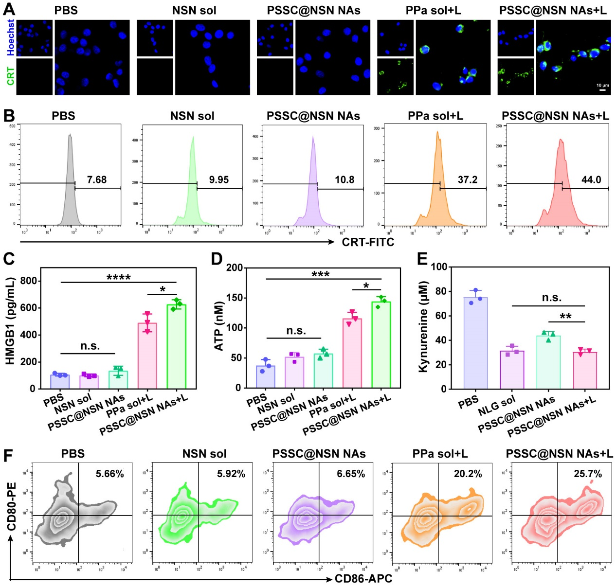 由于超分子纳米组装体具有高效的细胞摄取效率与胞内ROS产生能力,而PDT产生的ROS不仅仅可以直接杀伤细胞,还可通过触发包括CRTHMGB1ATP在内的DAMPs的产生,有效诱导肿瘤细胞的ICD,从而诱发抗肿瘤免疫反应。图6实验结果表明超分子纳米组装体显示出强效ICD诱导效果,显著促进了DCs成熟。