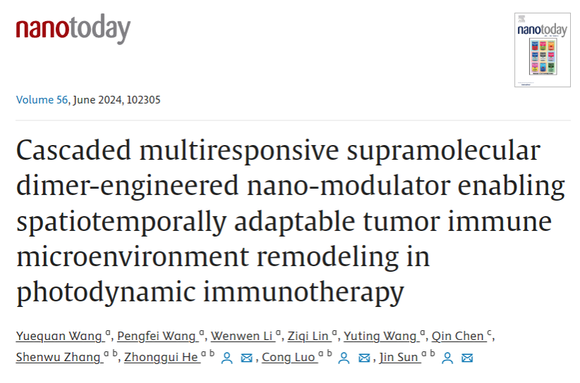 202456日,best365在线官网登录入口何仲贵/孙进/罗聪团队在爱思唯尔旗下期刊《Nano Today》(IF=17.4)发表题为“Cascaded multiresponsive supramolecular dimer-engineered nano-modulator enabling spatiotemporally adaptable tumor immune microenvironment remodeling in photodynamic immunotherapy”研究型论文,best365官网best365在线官网登录入口孙进教授、罗聪教授和何仲贵教授为本文通讯作者,2021级博士生王悦全为本文第一作者,best365在线官网登录入口第一通讯单位。