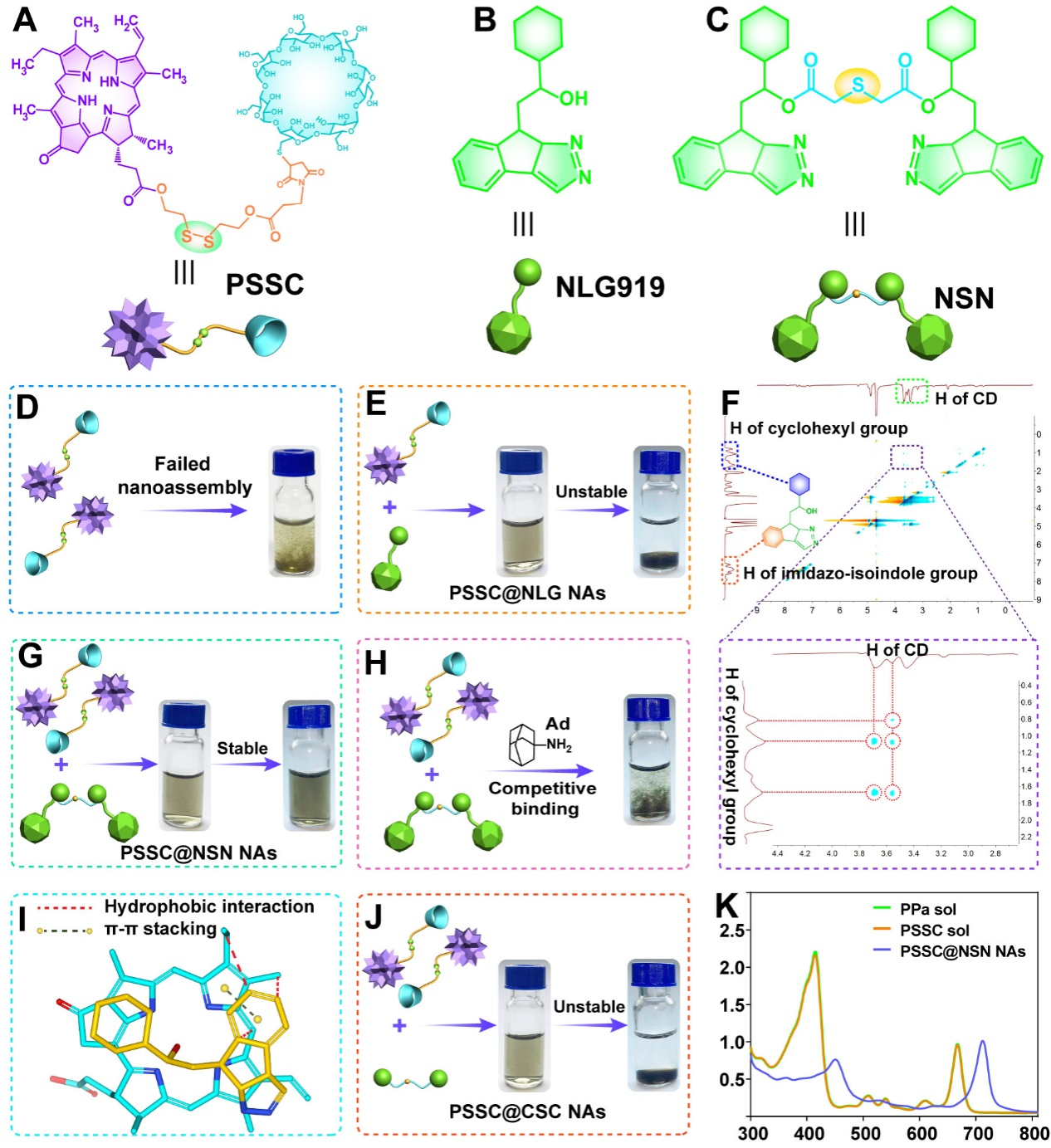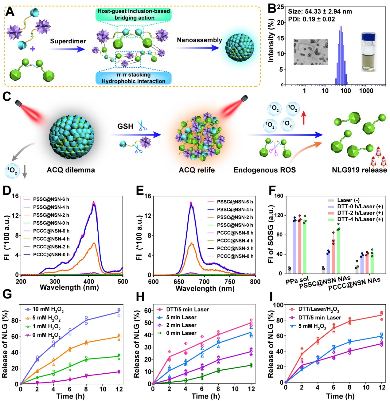 在这项研究中(图1),作者首次发现了一种超二聚体驱动的新型纳米组装模式并构建了一种具有时空自适应级联释药特性的超分子纳米组装体,用于高效共递送光敏剂PPaIDO抑制剂NLG919,并进一步与PD-L1抗体进行联用,以激活免疫反应并同时逆转免疫抑制微环境,从而增强肿瘤的光动-免疫治疗效果。合成了单硫键桥连的IDO抑制剂NLG919同源二聚体前药(NLG-S-NLG, NSN)与二硫键桥连的环糊精(CD-PPa偶联物(PPa-SS-CD, PSSC),首次发现了两分子PSSC与一分子NSN可以形成一种“超二聚体”结构,具有良好的纳米组装特性,基于此构建了一种新型的超分子纳米组装体(PSSC@NSN NAs)。值得注意的是,CD的引入不仅可以通过主-客体包合作用精确地驱动超分子纳米组装,而且还可以在没有PEG聚合物修饰的情况下赋予纳米组装亲水性表面,实现稳定组装递送。在肿瘤细胞中高GSH存在时,PSSC中的二硫键作为触发纳米组装解体的一级开关,有效缓解PPa的聚集诱导淬灭(ACQ)效应并促进1O2的产生和ICD的诱导效果。PPa产生的1O2和肿瘤细胞中高内源性ROS协同开启NSN中的单硫键二级开关,促进NLG919的快速释放。因此,超分子纳米组装体通过两级开关的引入可以级联实现ACQ缓解、ICD诱导、NLG919释放和IDO抑制,在两种荷瘤小鼠模型中均表现出良好的抗肿瘤效果,并与PD-L1抗体联合展现出协同治疗作用。