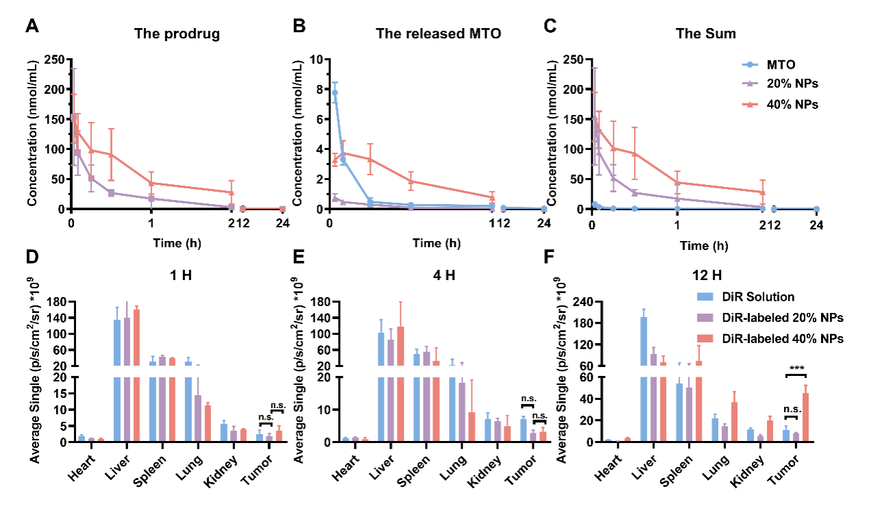 接下来,作者对纳米粒的体内命运进行研究。40% NPs因其更小的粒径和更好的组装稳定性,在血液循环中展现了更长的滞留时间和更高的肿瘤蓄积,同时仅有少量米托蒽醌在血液循环过程中从前药中释放来。这有望在保证治疗效果的同时降低与米托蒽醌相关的脱靶毒性。(图4)