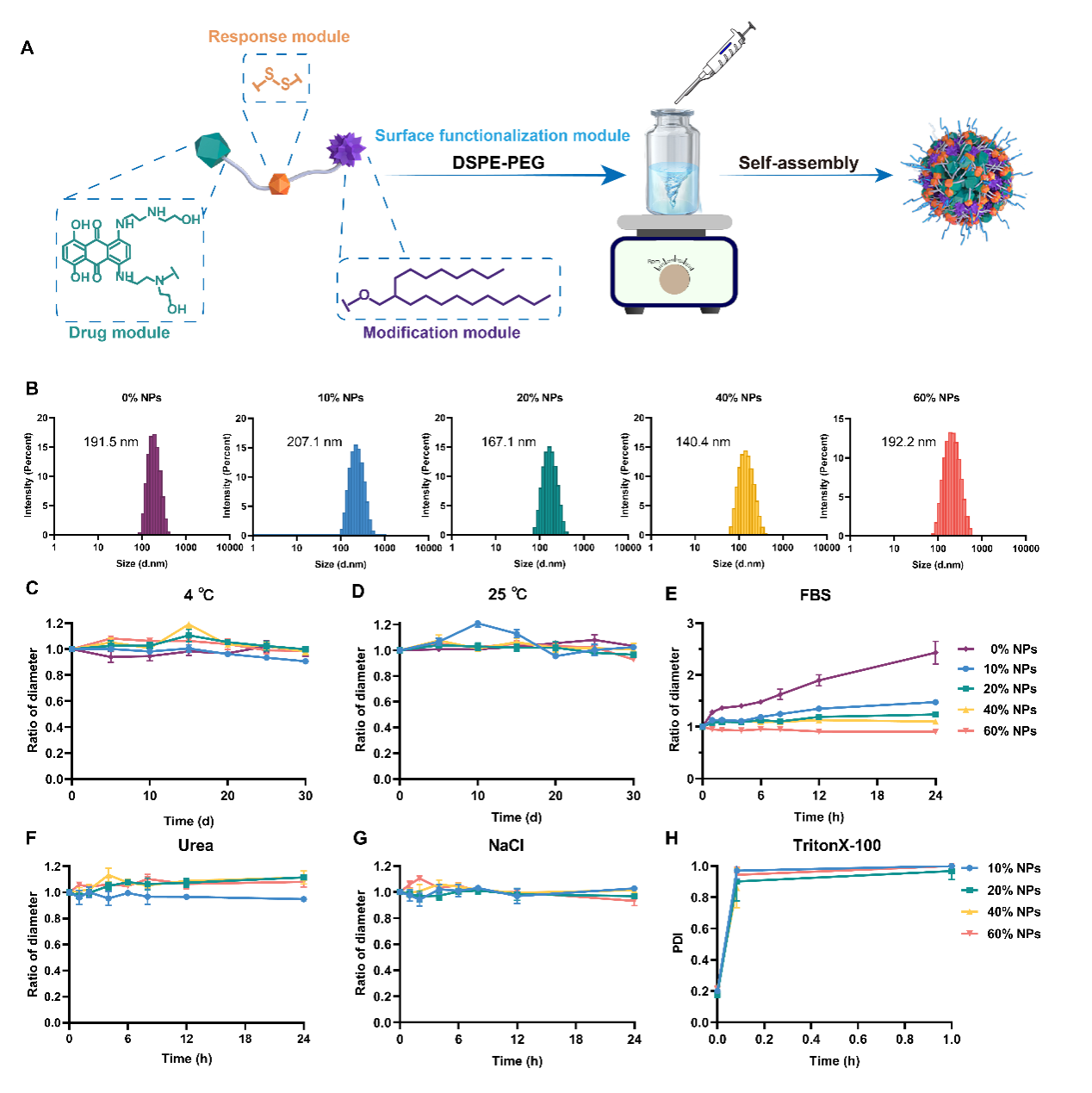 图1. 表面功能化模块对米托蒽醌前药自组装纳米粒的影响。