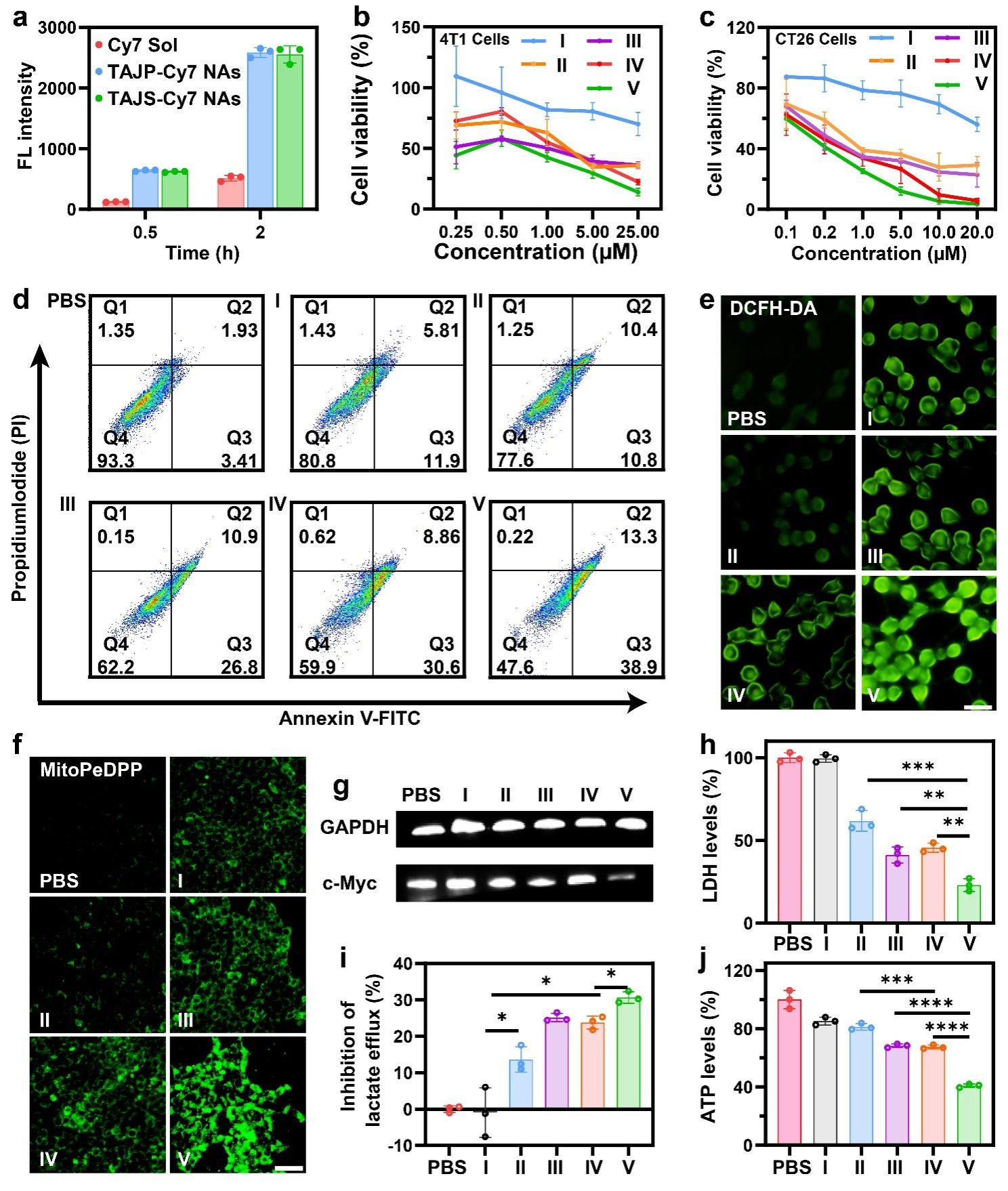 接下来,考察了Cy7标记的纳米耗竭器在4T1细胞中的摄取行为(图4)。实验结果表明,纳米耗竭器的形成提高了细胞摄取效率并具有时间依赖性。并且,TAJS NAs在多种细胞模型中均表现出最强的细胞毒性(图4)。随后,作者通过测定4T1细胞中ROS、线粒体脂质过氧化、c-Myc、乳酸、乳酸脱氢酶(LDH)、ATP的水平,评估两者发挥协同作用的机制(图4)。结果表明,含TPP-AA的组别处理4T1细胞后,细胞内ROS积累明显增强,这可能是由于TPP-AA诱导肿瘤细胞线粒体膜脂质过氧化所致,所有含JQ1的组别均下调了细胞c-Myc水平,证实了JQ1对糖酵解途径的抑制作用。此外,JQ1介导的糖酵解抑制导致LDH和乳酸外排显著降低。由于TPP-AA和JQ1对肿瘤细胞糖酵解/线粒体能量轴的协同抑制,TPP-AA和JQ1的结合导致细胞ATP水平显著降低,其中TAJS NAs表现出最明显的效果。这些结果证实,TPP-AA与JQ1联合使用确实存在糖酵解/线粒体双阻断能量耗竭的协同机制。