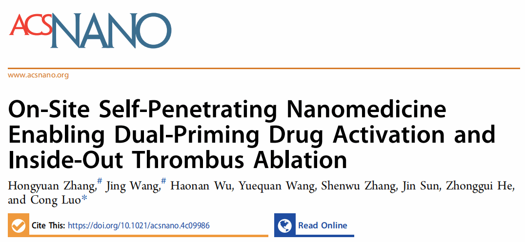 近日,best365在线官网登录入口罗聪教授团队在《ACS Nano》(IF=15.8)在线发表了最新研究成果“On-Site Self-Penetrating Nanomedicine Enabling Dual-Priming Drug Activation and Inside-Out Thrombus Ablation”。该研究提出了一种基于光热/光动双效光敏剂与氧化响应抗血小板前药共组装实现多模式激活抗血栓前药的新策略,有望解决血栓ROS异质性导致的前药激活瓶颈难题。在该研究中,作者首先设计合成了一种抗血小板药物替格瑞洛(TGL)的氧化响应前药(TGL-S-Fmoc, TSF)。随后,发现TSF可以与光热/光动双功能的光敏剂IR808共组装形成稳定的纳米结构。基于此,作者开发了一种自穿透、自激活、多模式协同的无载体纳米组装递药系统(T-TSFI NAs)。在光热效应的辅助下,T-TSFI NAs不仅能够实现血栓的深部穿透,还通过产生ROS协同内源性ROS触发前药按需激活,栓块内部释放抗血小板药物TGL,从而实现光热/抗血小板协同溶栓。T-TSFI NAs在FeCl₃诱导的大鼠颈动脉血栓模型中不仅有效抑制了血小板的激活和聚集,还显著降低了出血风险。这一策略成功克服了血栓微环境中ROS分布不均的难题,为抗血栓前药按需高效激活提供了新思路。