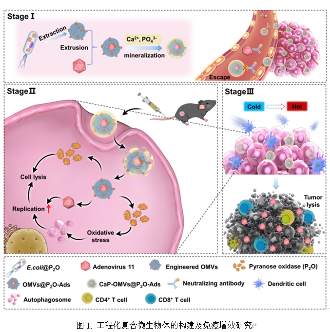 溶瘤病毒(OVs)疗法作为一种具备高效选择性和良好肿瘤杀伤能力的免疫疗法,近年来备受关注。然而,静脉递送效果差、瘤内复制效率不佳及免疫激活能力弱等关键问题制约着OVs临床应用。为此,best365官网孙进教授团队报道了基于工程化细菌外膜囊泡(OMVs)的OVs静脉递送系统来提高OVs免疫治疗效率。首先,作者通过基因工程手段获取含吡喃糖氧化酶(P2O)的OMVs。之后采用该囊泡为载体,通过挤压法在其内部荷载OVs,并利用仿生矿化技术在其表面修饰纳米级无定形磷酸钙。该系统屏蔽了表位抗原,能够延长在体循环时间,通过EPR效应促进OVs在肿瘤处的富集。利用P2O的催化作用能够有效提升肿瘤内氧化应激水平,促进癌细胞过度自噬,并以自噬小体为复制场所,增加OVs复制效率。此外,OMVs作为免疫激活剂,可重塑肿瘤免疫抑制微环境,进而增强OVs介导的抗肿瘤免疫响应。本项目将为OVs介导的抗肿瘤免疫增效提供重要的理论基础和可行的解决策略。相关成果发表在《Nature Communications》期刊,论文题目为:Engineered bacterial outer membrane vesicles encapsulating oncolytic adenoviruses enhance the efficacy of cancer virotherapy by augmenting tumor cell autophagy。