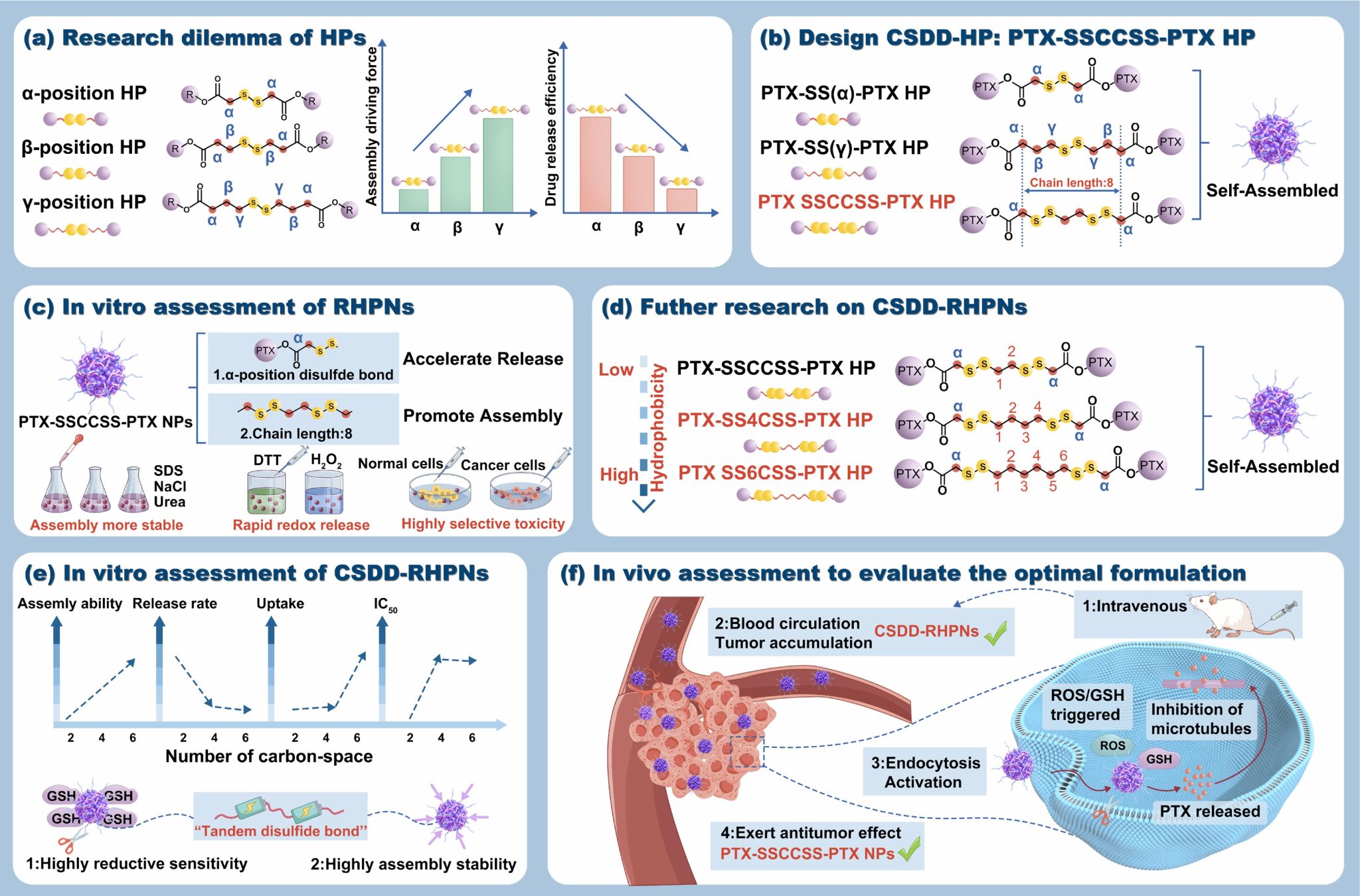 初步实验表明,CSDD化学桥连可显著增强RHPNs的组装能力和药物释放性能,特别是在组装稳定性、还原反应性和选择性毒性方面。鉴于CSDD-RHPNs在探索性实验中表现出的优异性质,我们进一步设计了带有4个和6个碳原子间隔的CSDD-RHPNs,以研究化学桥连对RHPNs性能的潜在影响。有趣的是,与SD-RHPNs相比,这些CSDD-RHPNs具有出色的组装能力、安全性和延长的循环时间。此外,结果表明,具有两个碳原子间隔的CSDD-RHPNs由于其快速的药物释放效率和良好的组装稳定性而表现出最佳的抗肿瘤效果。本研究首次在RHPNs的设计中引入CSDD化学桥连,同时提高了RHPNs的组装稳定性和药物释放率。这为化学桥连选择提供了一种新的策略,并为响应性化学桥连位置的影响提供了参考,为RHPNs的设计开辟了新的途径。